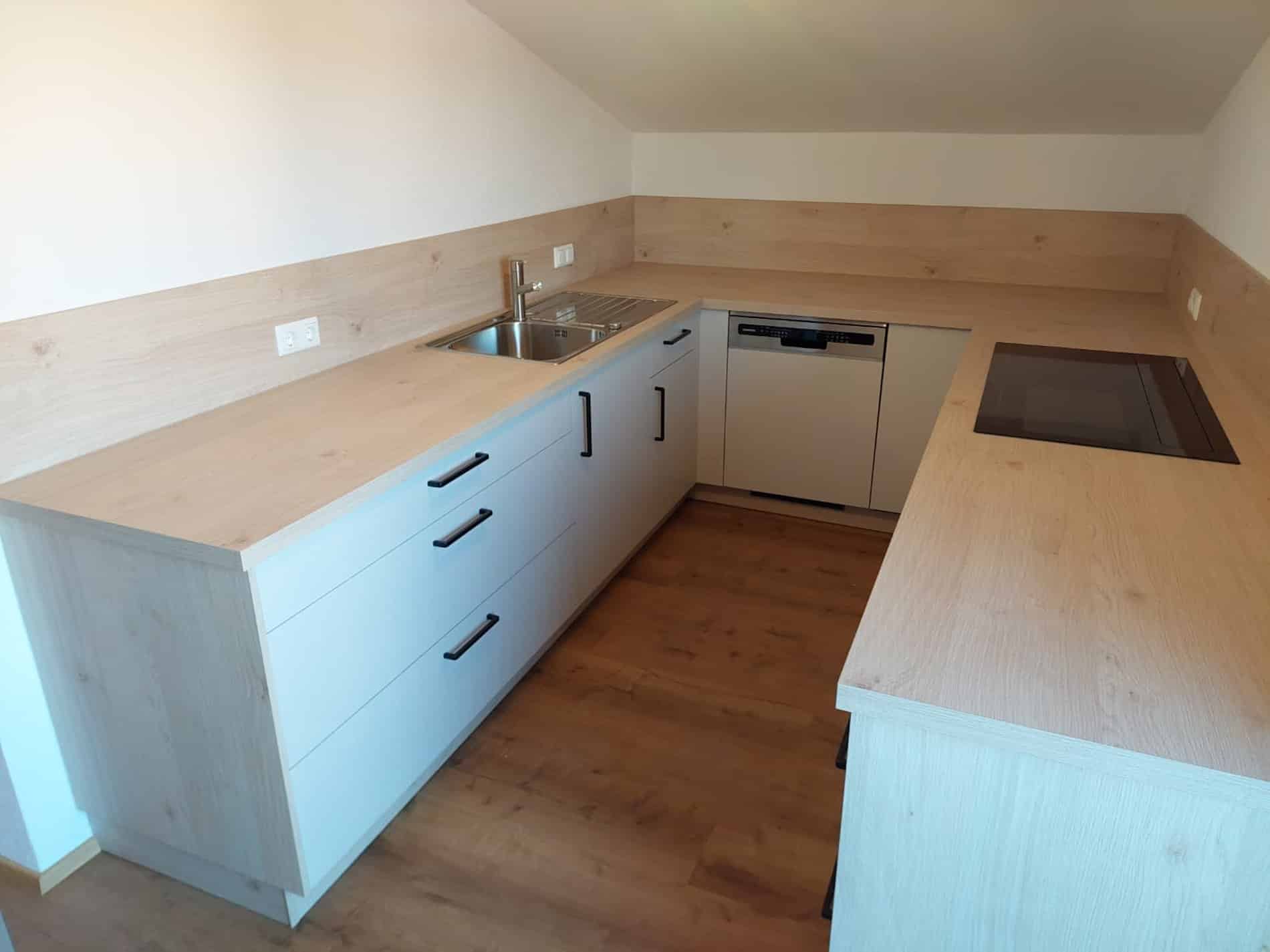 Eine der größten Herausforderungen bei dieser Küche war die Planung unter einer Dachschräge. Dachschrägen stellen besondere Anforderungen an die Küchenplanung, da Standardlösungen hier oft nicht ausreichen. In diesem Projekt wurde jeder Zentimeter optimal genutzt, um eine funktionale und zugleich ästhetische Küche zu realisieren.