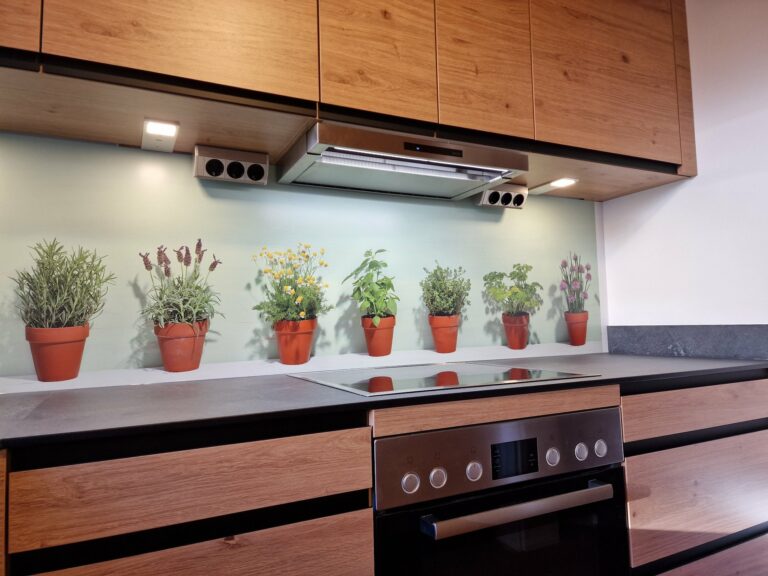 Das Design orientiert sich an geraden Linien. Horizontale Holzmaserung und schlanke Griffleisten sowie eine nur 12 Millimeter dicke Arbeitsplatte mit schwarzem Kern unterstreichen dies. Als kleine Besonderheit ist die Nischenrückwand aus Alu-Dibond mit einem Motiv nach Kundenwunsch bedruckt. Natürlich darf ein solches Motiv nicht durch Steckdosen unterbrochen werden und deshalb sind an verschiedenen Stellen unter den Hängeschränken spezielle Steckdosen verbaut.