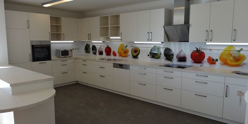 insgesamt 2 Gruppenküchen einer therapeutischen Einrichtung mit behindertengerechten Ausstattungen, Tresen mit Durchreichefunktion