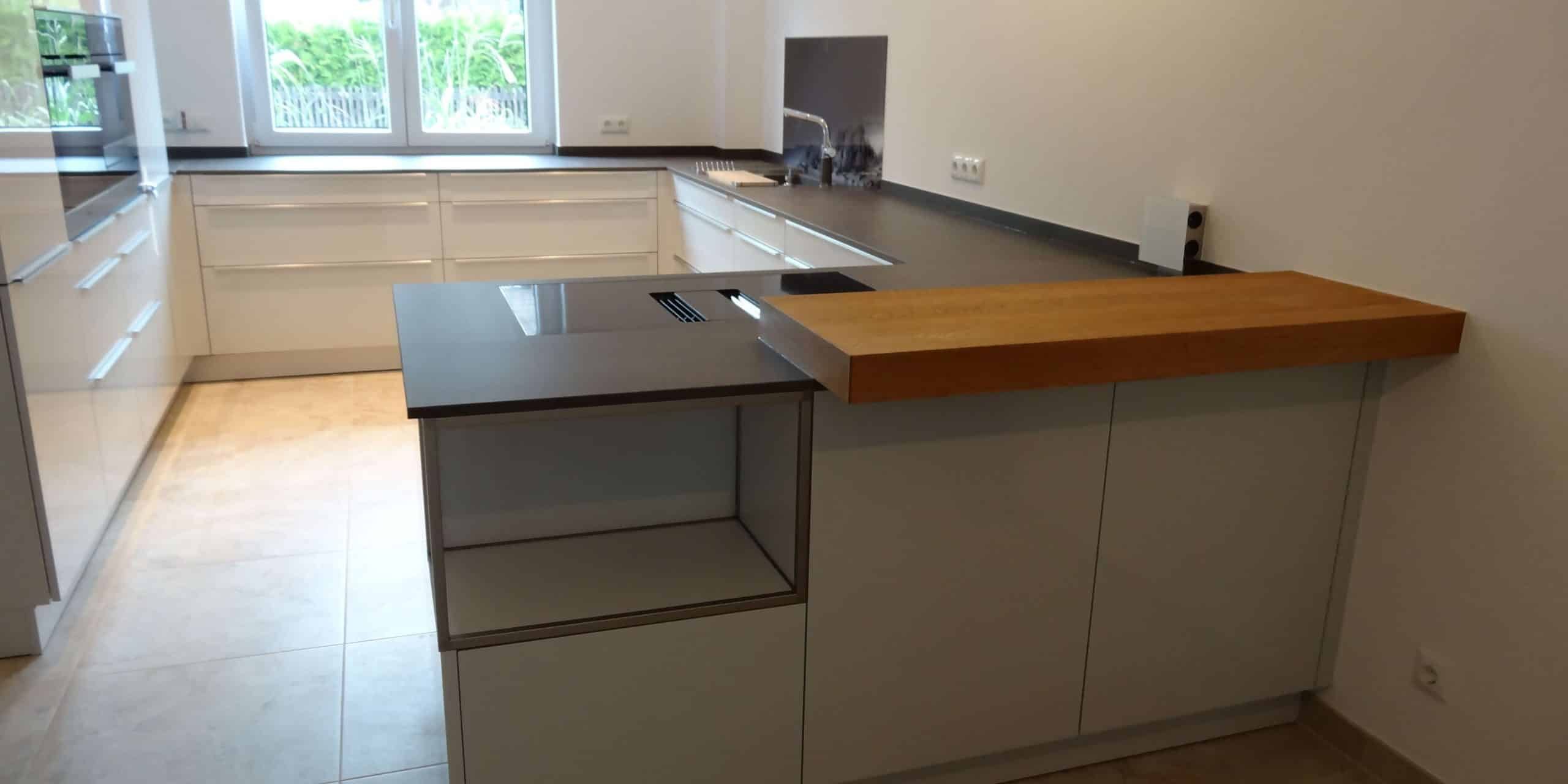 Die Keramik-Arbeitsplatte von Lechner bietet ausreichend Arbeitsfläche und ist dabei nicht nur leicht zu reinigen, sondern auch nahezu unzerstörbar. Natürlich sind alle Einbauten in die Arbeitsplatte flächenbündig ausgeführt.